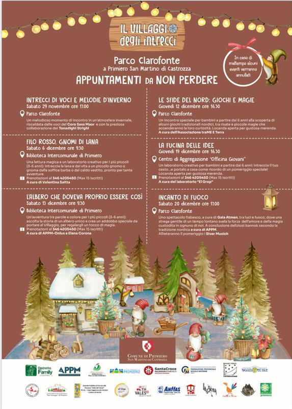 Inaugurazione del "Villaggio degli Intrecci" con concerto del Coro Sass Maor e merenda insieme ai Tonadighi Strighi!Progetto di comunità che vede coinvolte moltissime associazioni e enti del territorio, con numerose proposte pensate per vivere insieme ai più piccoli un magico avvento.